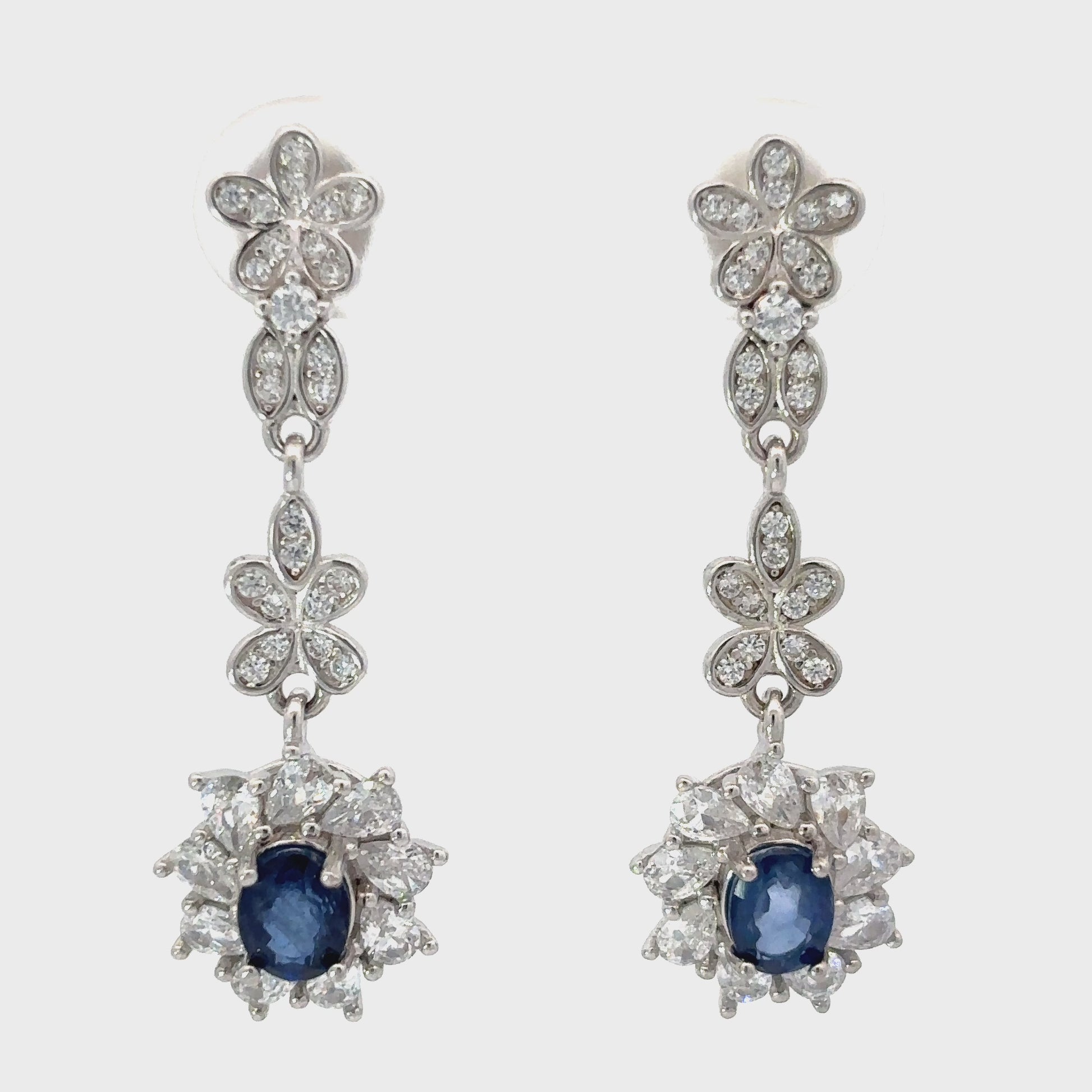 The vivid blue sapphires are set with a contemporary halo of sparkly diamonds that is dropped from an intricately made, bezel set diamonds balancing the floral arrangements and precise metal work. Set in 100% recycled 925 sterling silver. Comes with a complementary piece of polishing cloth.